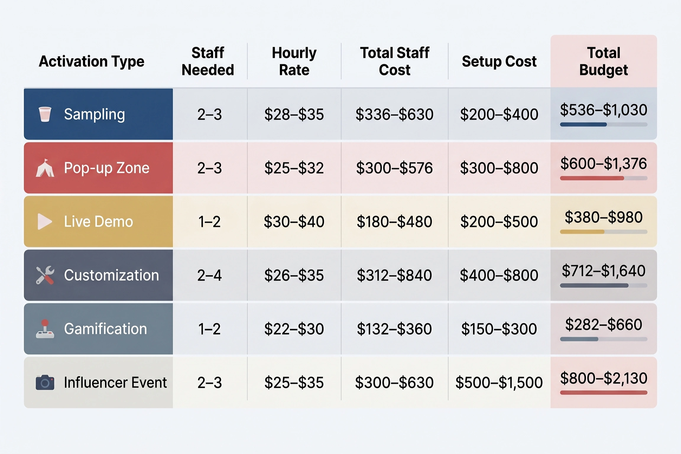 Staffing: 2–3 trained brand ambassadors at $40–$50/hr (retail activation standard range)