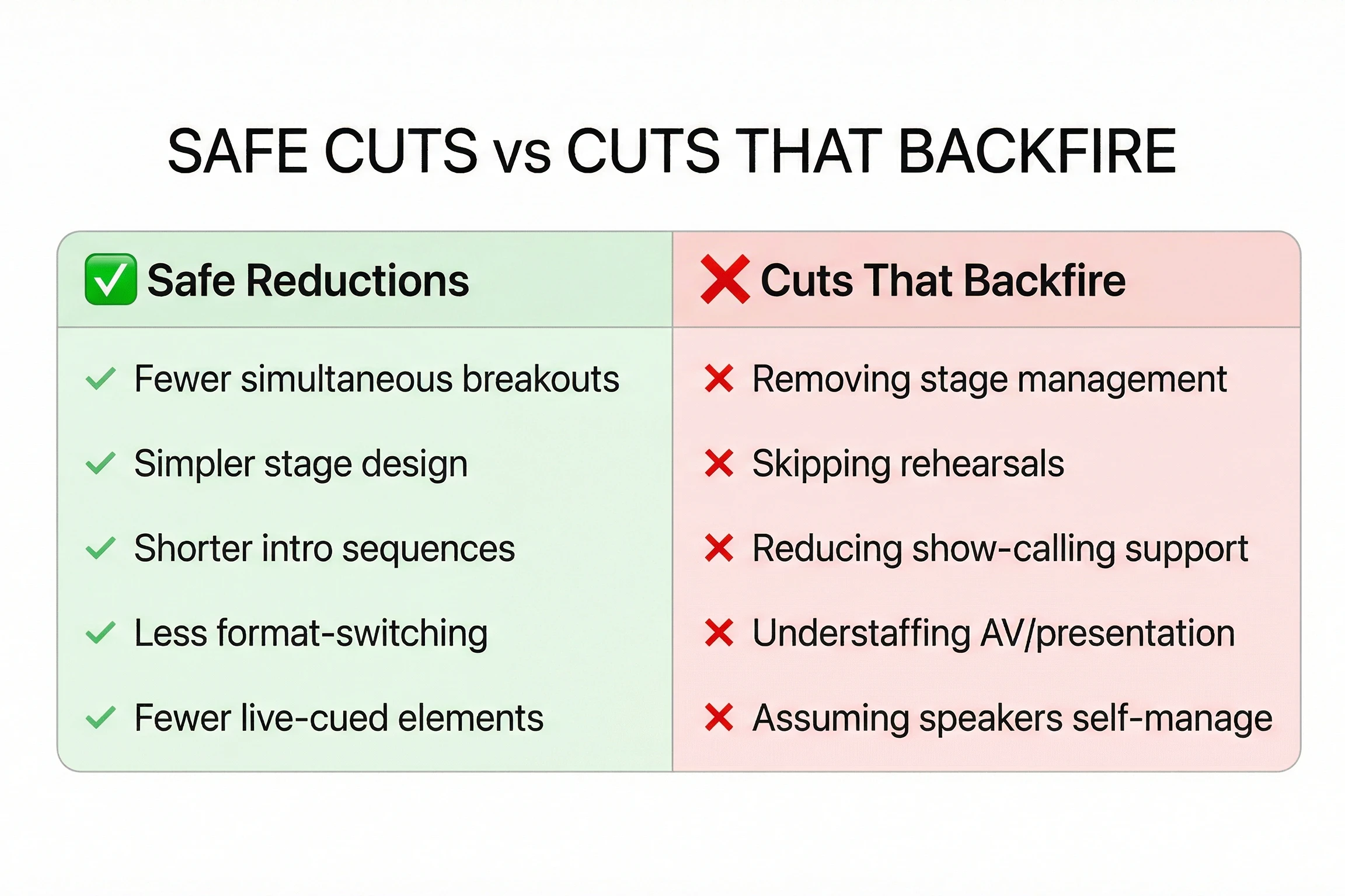 You can reduce conference production services safely, but only if you remove complexity first. That is the part teams miss. They try to cut support before they simplify the show.