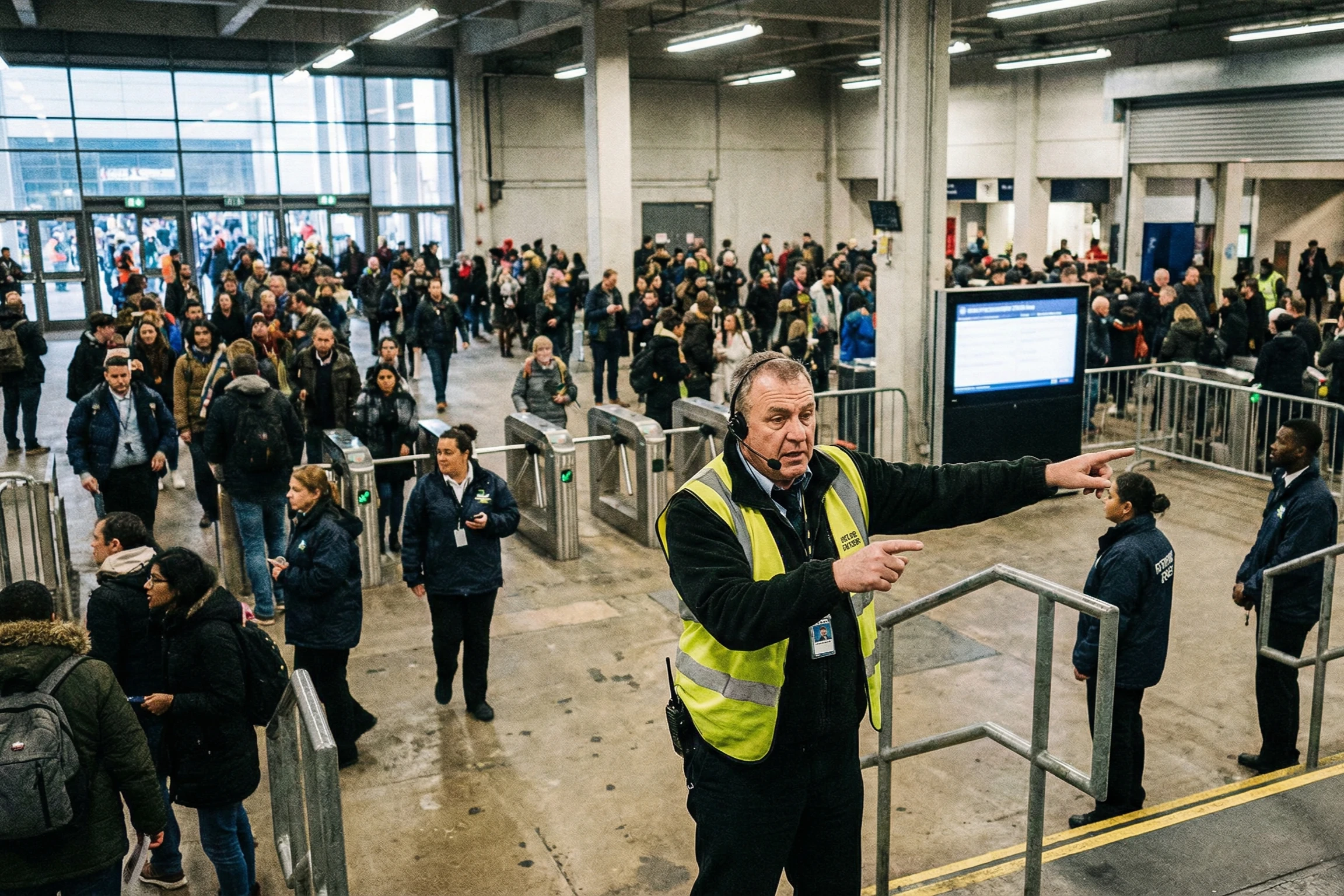 - The crowd flow team lead manages the movement strategy across multiple access points during peak entry and exit windows, coordinating directly with the event operations team.