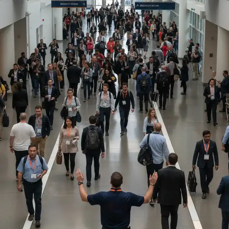 Think of your attendee count as water pressure. When a general session ends, you dump 2,000 people into a hallway designed for 500. This is not a service issue; it is a physics issue. Without dedicated Crowd Management acting as human bollards to divert traffic, you get dangerous compression points. According to venue safety standards from the International Association of Venue Managers (IAVM), managing this density requires personnel whose sole responsibility is routing flow away from pinch points.
