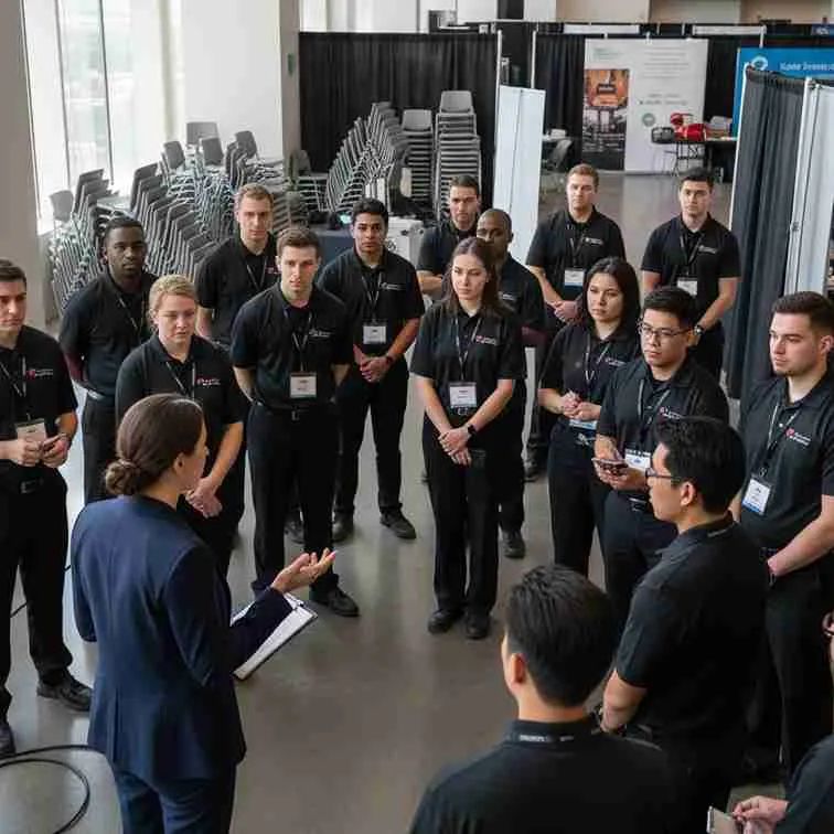 We operate on the "Pre-Shift Rally" model. Every morning, supervisors brief the team on VIPs, schedule changes, and safety protocols. We also prioritize multi-day badge management, keeping the same staff for the full 3-day run. By day two, the team is operating on autopilot because they know the flow. This consistency is exactly how hospitality staff elevate guest experience.