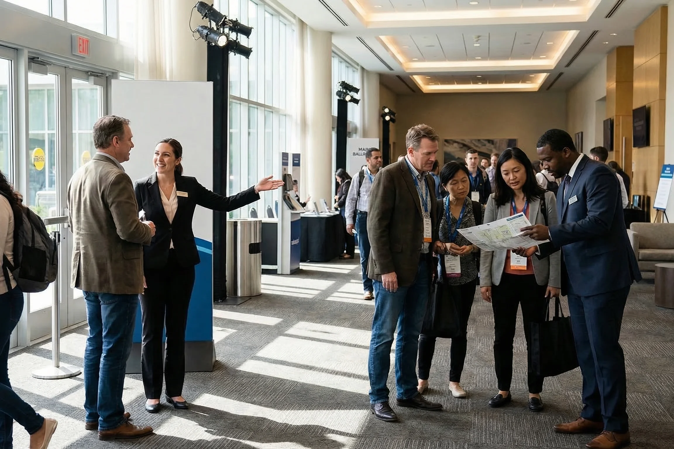 - Directing guests toward entrances, exits, or session rooms