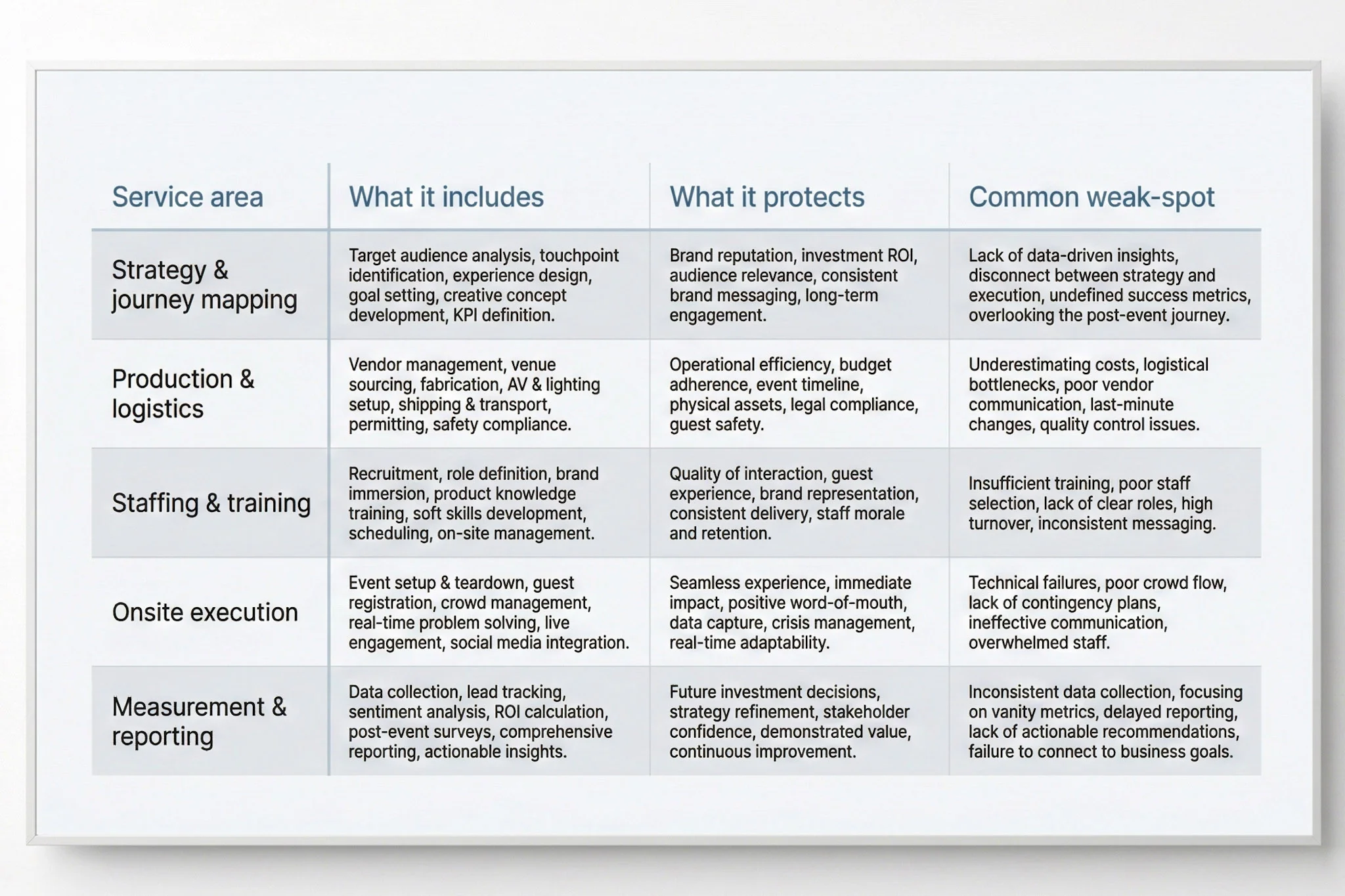 Strong services for branded event activations aren’t one thing. They’re a stack of controls that hold the day together.