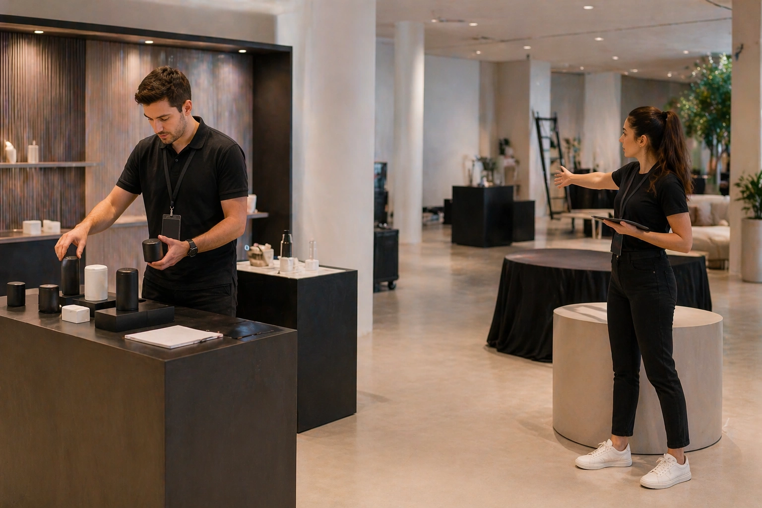 Product reps mainly own the deeper interaction environment, where guests stop for guided explanation, trials, side-by-side comparison, and more serious buying questions. Their space is built for consistency, product discipline, and controlled demo flow.