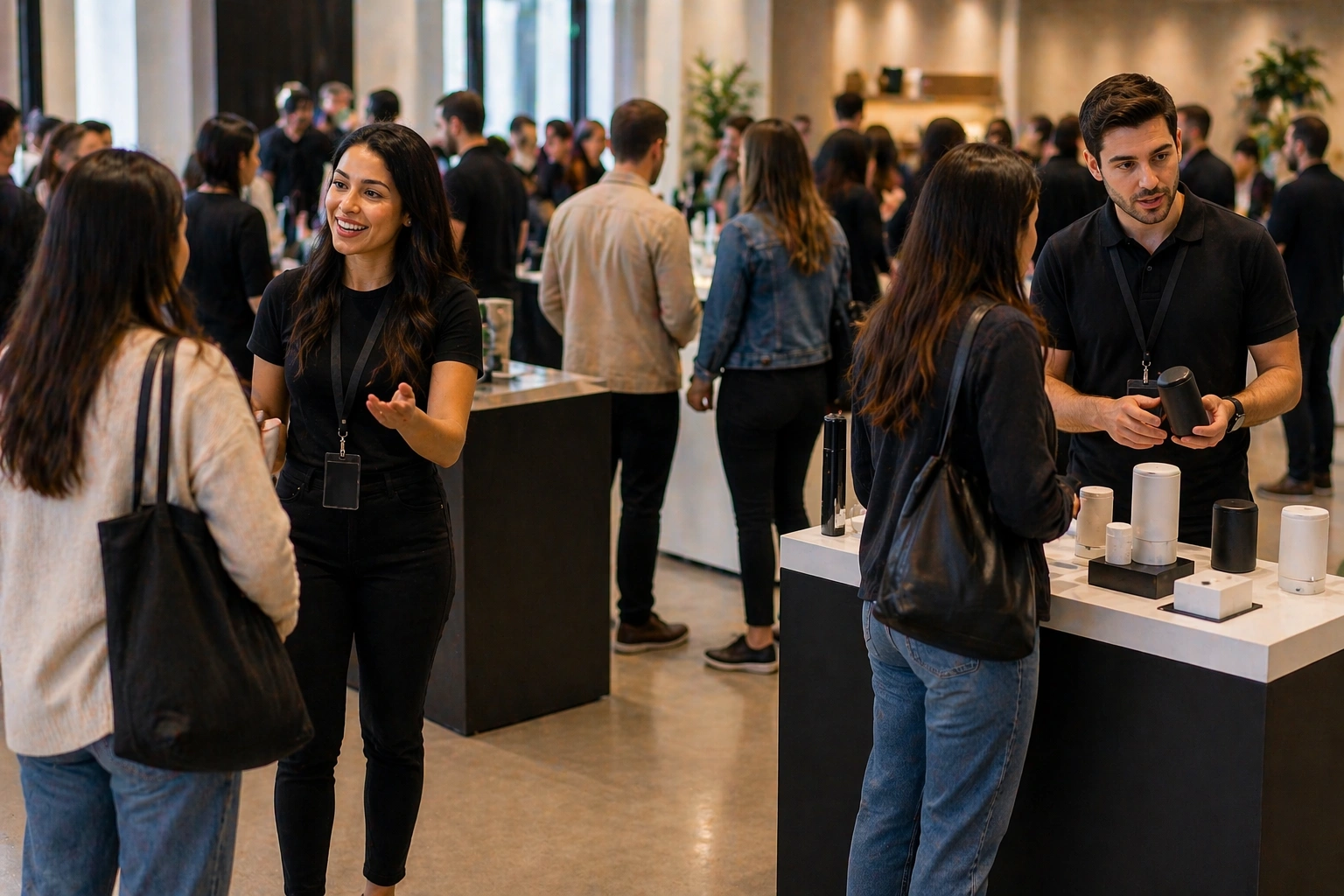 The cleanest setup gives each role a clear job. Brand ambassadors should open the interaction, frame the value quickly, and lightly qualify the guest without overexplaining. Once the guest needs a demo, comparison help, or a more serious buying conversation, the handoff should move to a product rep. That split keeps the front end active while protecting depth further into the footprint. It also stops specialists from being pulled into constant first-touch interactions when traffic volume rises and guest intent starts mixing together.