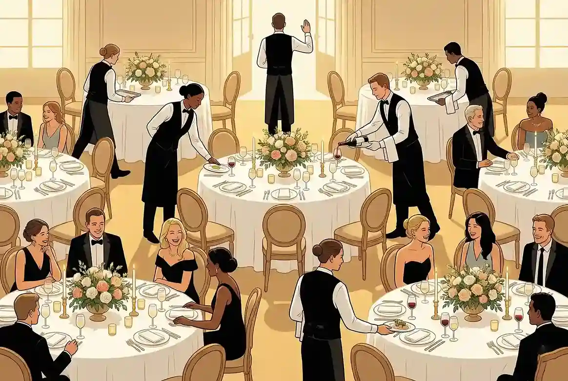 - Corporate event (5,000 sq. ft ballroom): 10–12 staff for 4 hours.