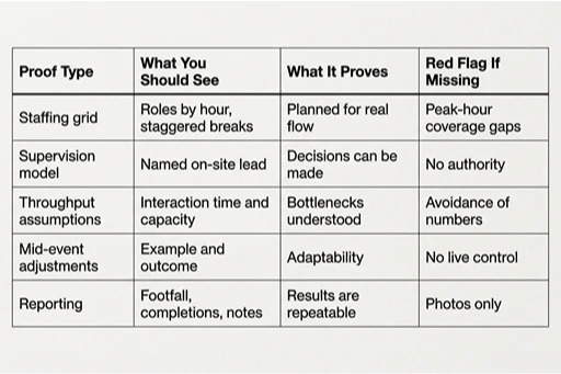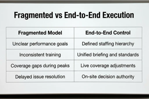The best event organizer for brand activations is defined by execution, not presentation. Reliable partners can clearly explain how throughput is calculated, how staffing ratios are protected during peak demand, and how supervision authority prevents performance drop-off after hour four. Expert corporate event planners for experiential brand activations focus on minute-by-minute control rather than ideal conditions. They plan for fatigue, variability, and traffic compression so engagement quality remains consistent throughout the event.