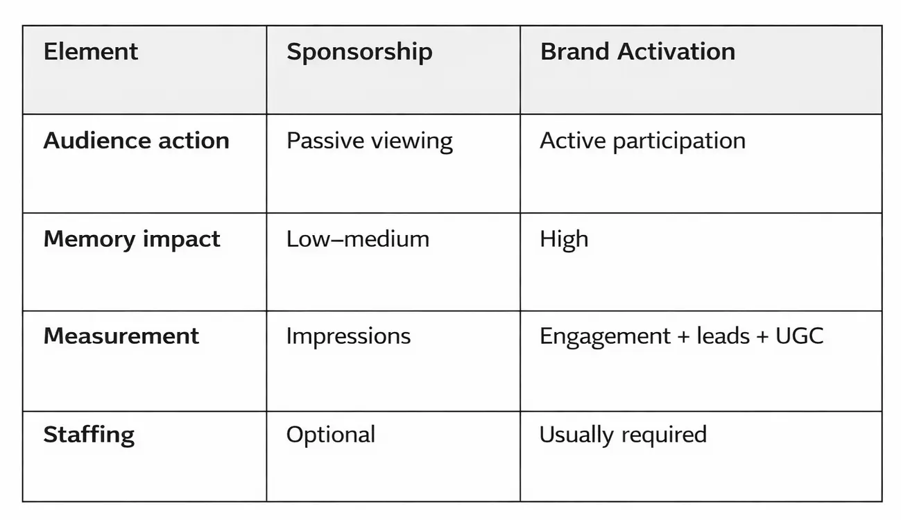 On-site, the distinction is operationally obvious. A concourse activation supported by trained staff will stop traffic and generate interaction. A wrapped pillar or static sign will not. Brand activation at sports events requires staffing, throughput planning, reset timing, and venue compliance. Labor is not an add-on. It is the product.