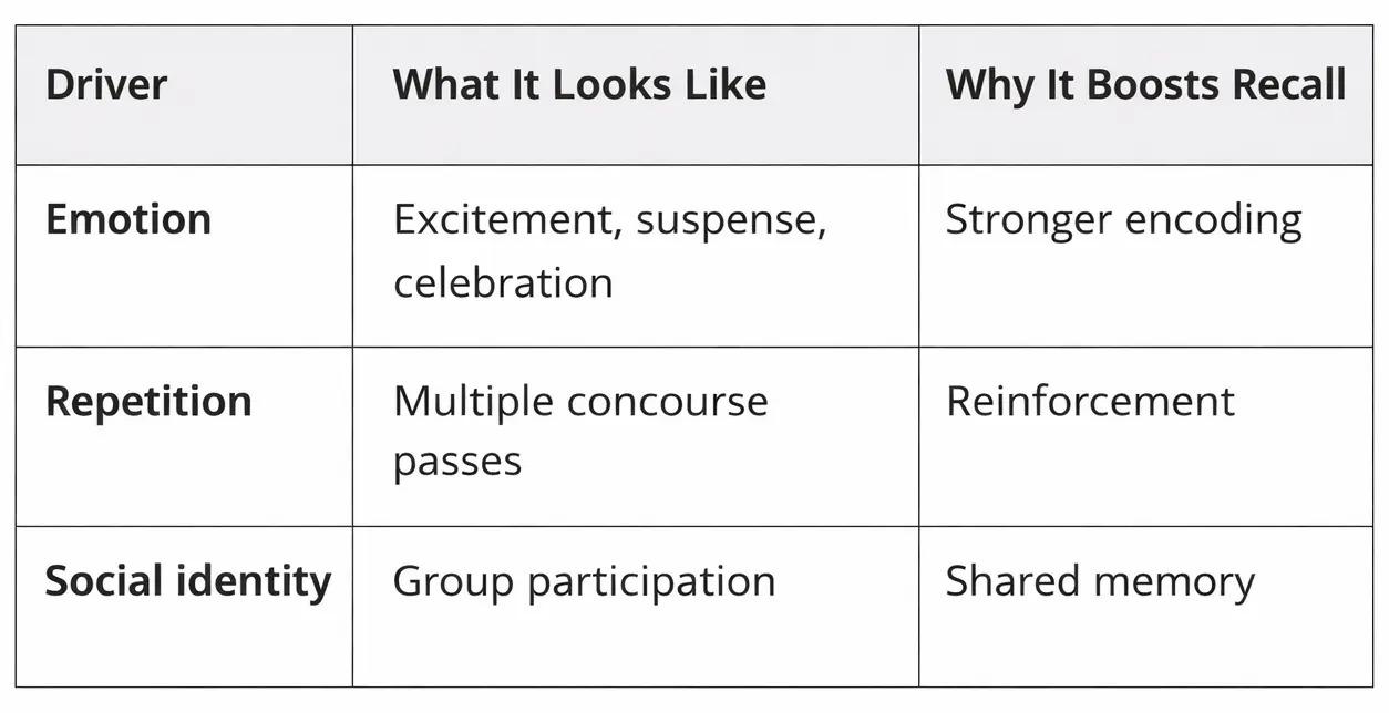 Brand activation at sports events succeeds because it aligns with how memory is formed in high-energy, social environments. Three psychological drivers consistently increase recall when activations are executed correctly on game day.