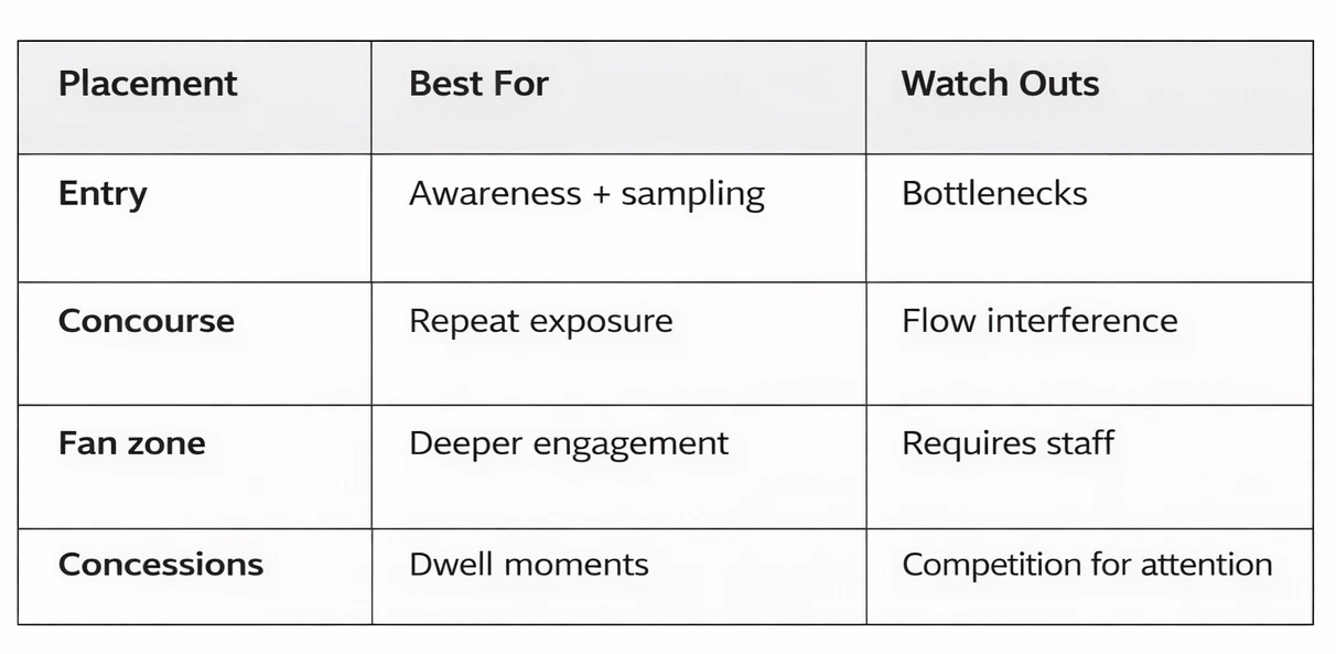 Fan zones allow deeper engagement, longer dwell, and better data capture. They also require more supervision. Near the concessions works because people already pause. You are borrowing dwell time, not creating it. Exit routes reinforce recall. Energy is lower, but memory is fresh.