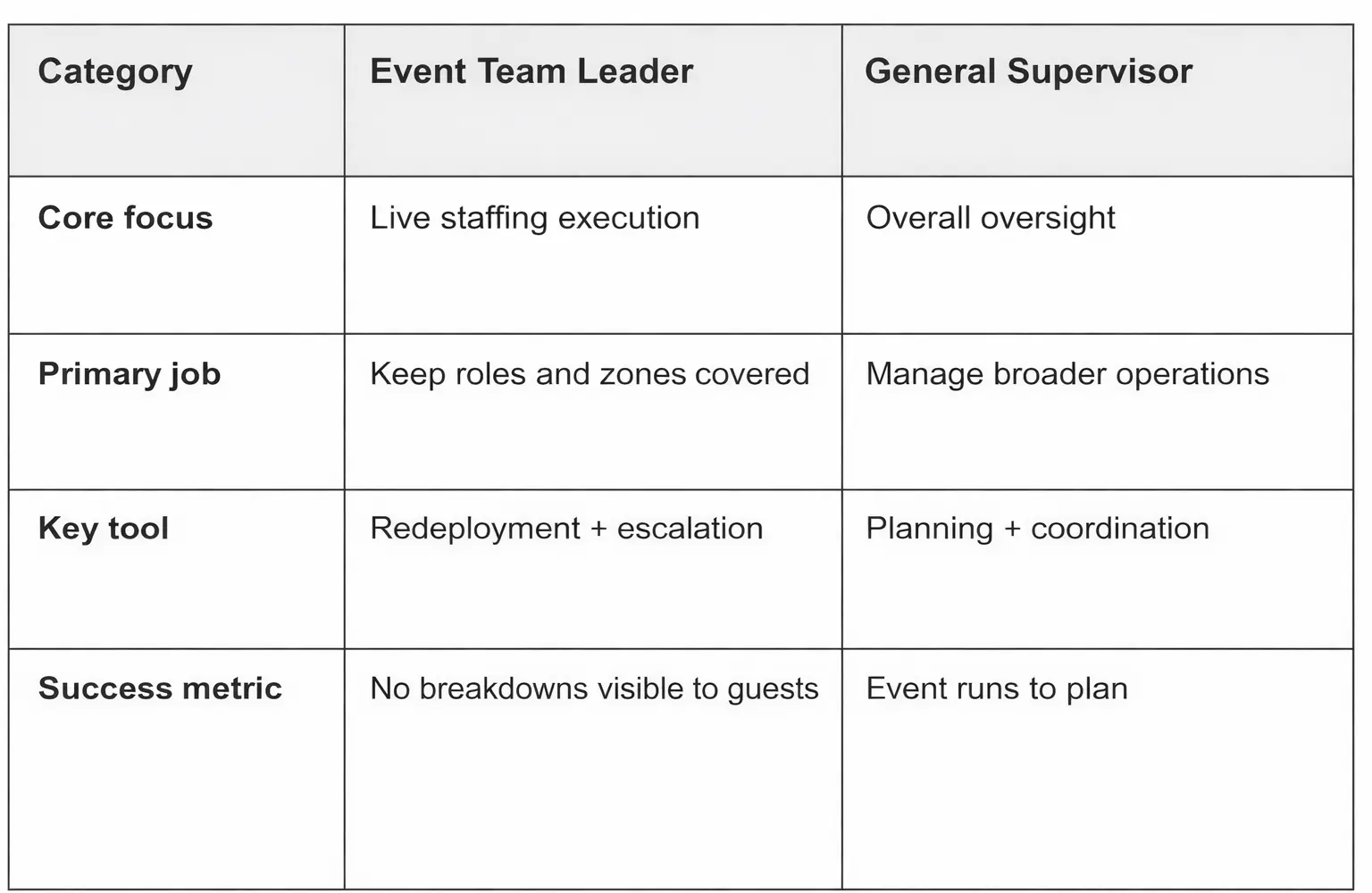 A general supervisor focuses on overall event logistics and timeline coordination. An event team leader focuses specifically on people, performance, and real-time staffing stability.