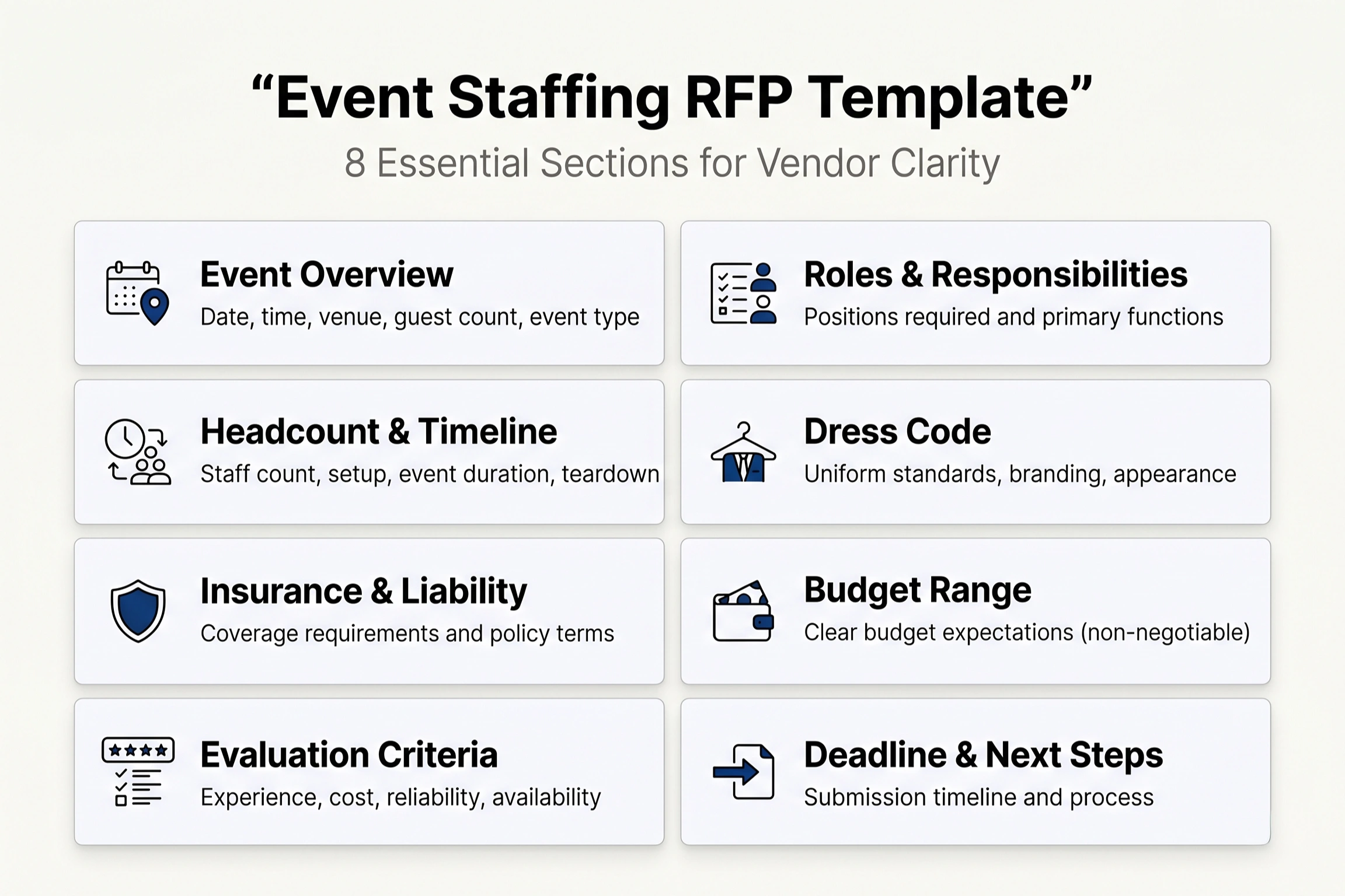 A clear event staffing RFP template dramatically cuts response time. For large-scale events, a structured RFP is essential. Most planners spend far longer chasing vendor questions than writing a clear RFP upfront.