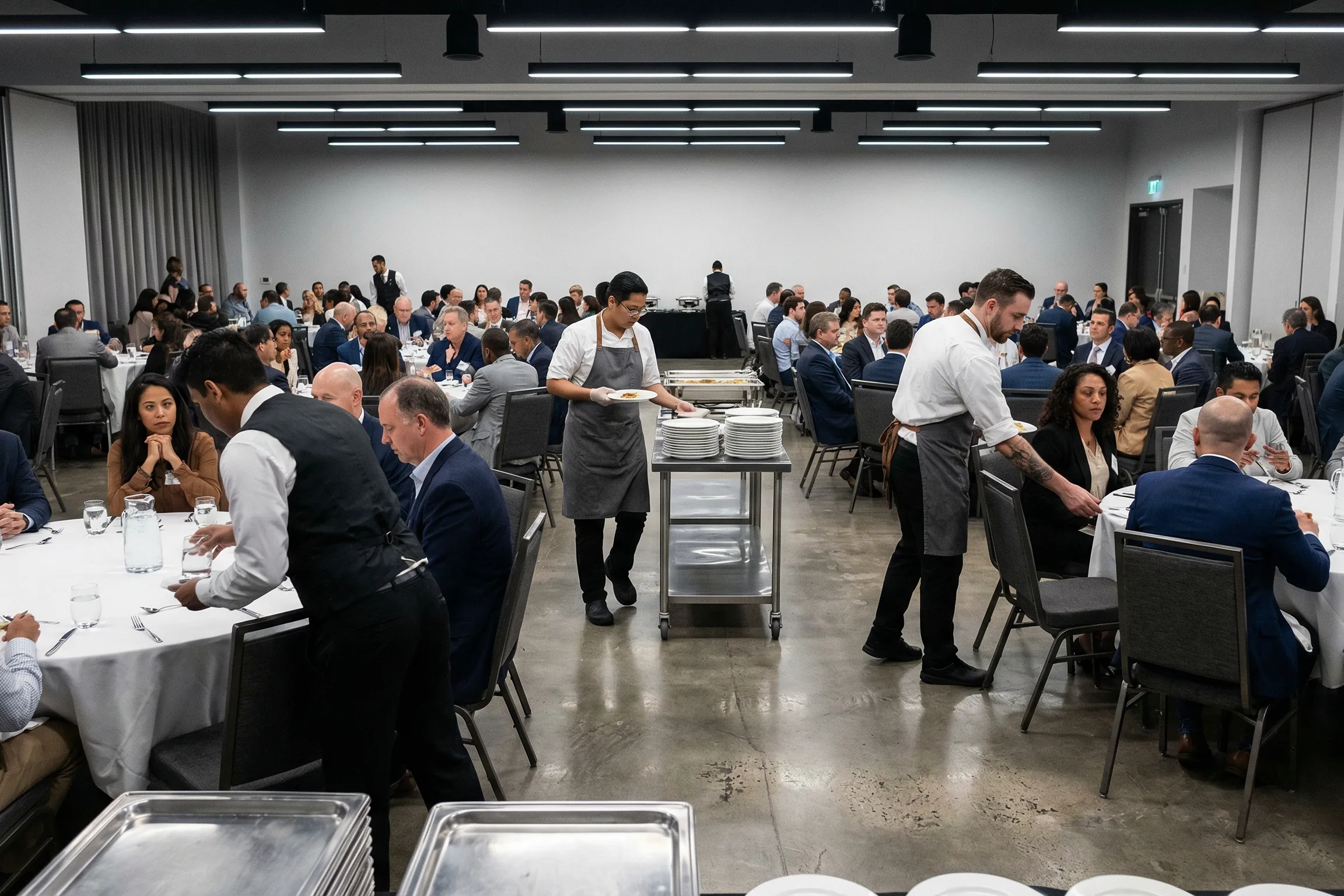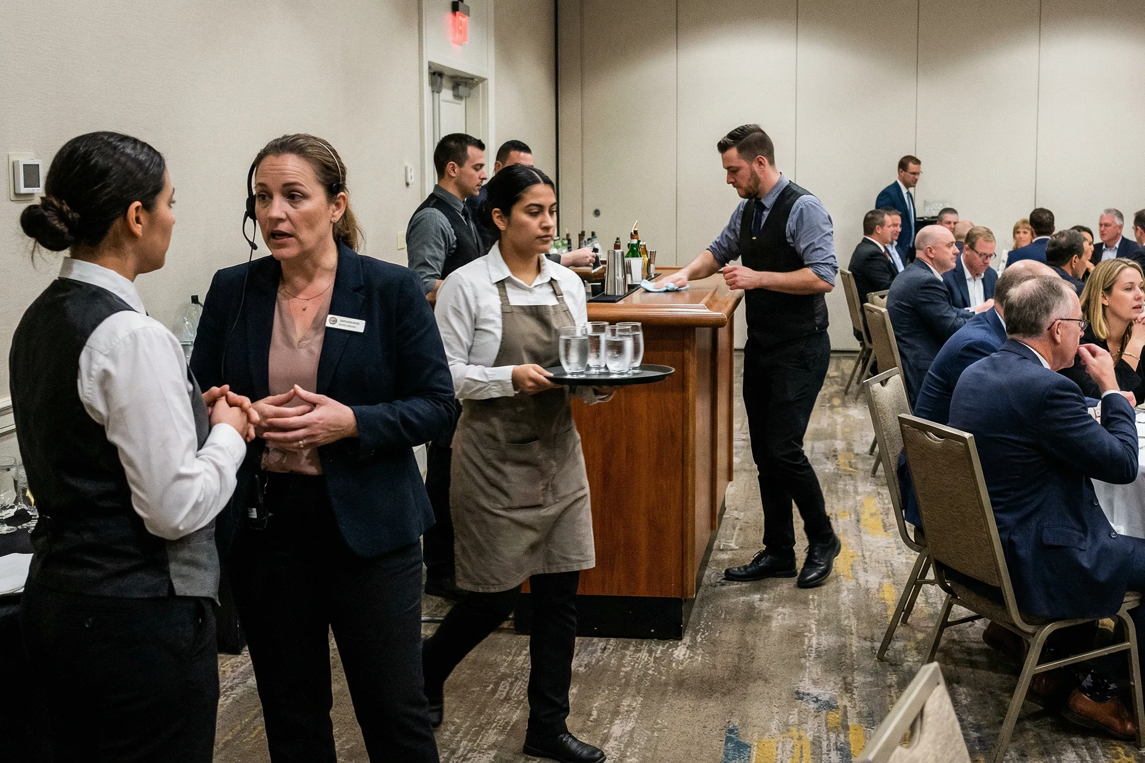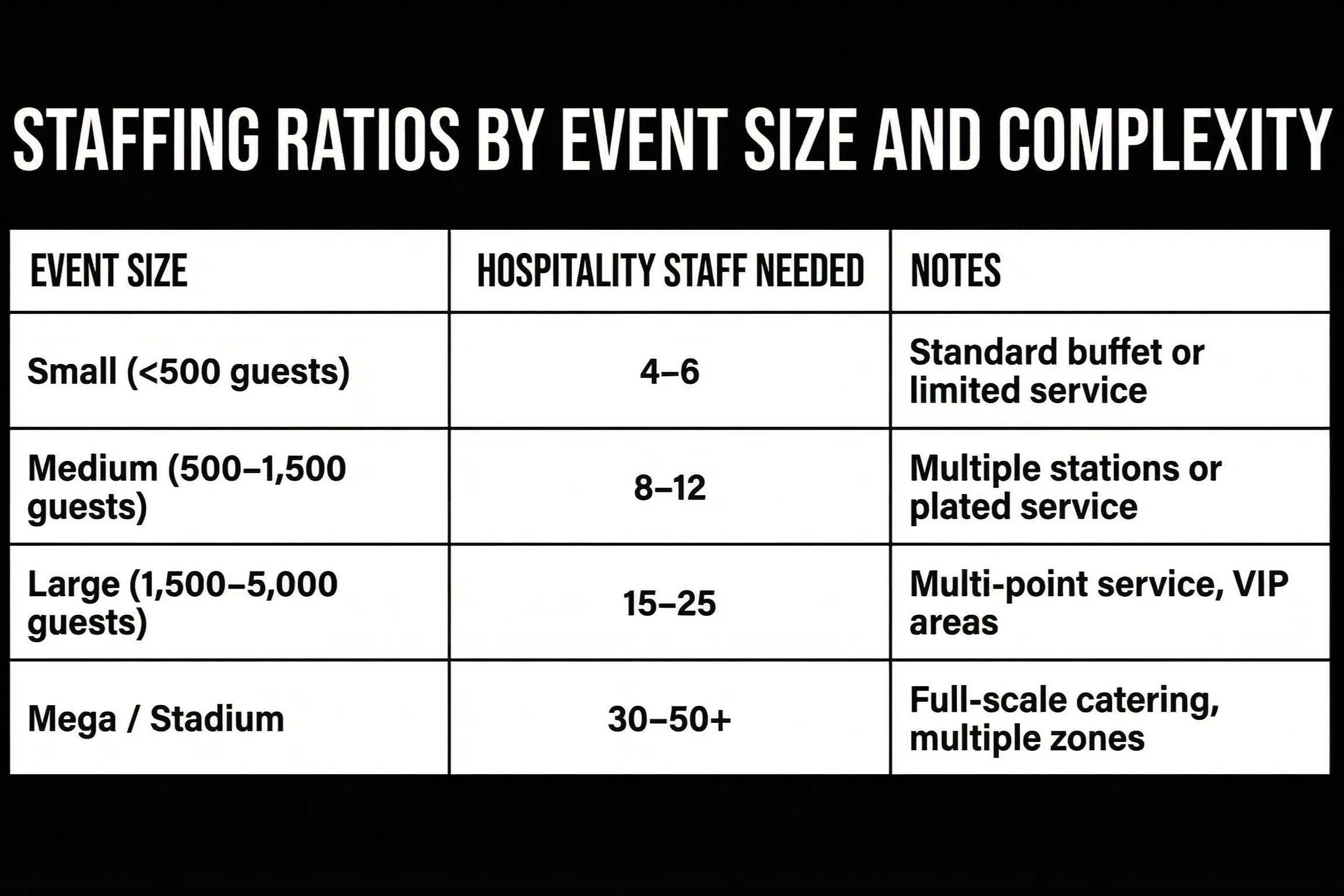 Pro Tip: Increase event catering staff by 15% to 30% for multi-course menus, VIP areas, or complex layouts where travel time slows replenishment cycles.